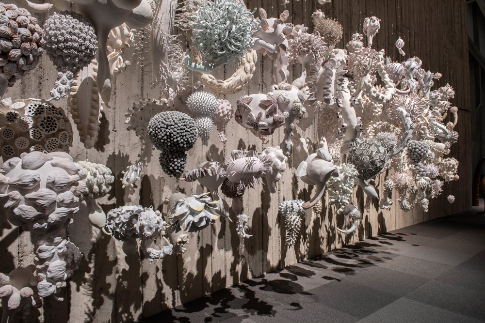 | Mixed media installation: gourds, seeds, metal, monofilament line, glues, paint. The sound track of birdcalls created by John Freeman Dimensions: 20 x 10 x 3 feet | Artist Statement Curtain of Life The world is full of seeds: important both in nature and our culture and fundamental to our survival. Because seeds are commonplace in our lives their fragility is often overlooked and their continued existence taken for granted by many in North America. Without the constant regeneration and growth of seeds we cannot exist. The vitality and beauty of fruits and their seeds is our inspiration in a world that is undergoing many threats to seed diversity brought on by climate change. The vitality and beauty of fruits and their seeds is my inspiration and this piece celebrates the possibility for continued plant biodiversity. I have chosen to work primarily in a very pastel colour range. I considered how the lack of intense hues can suggest a kind of fading out or disappearance. White can also reference the beauty of the cold winter months when most plant life is snow-covered. All of the forms have been constructed from natural materials exploring the rich variety of specimens using multitudes of dried gourd forms overlaid with seed and seedpods and occasionally shells. Lyndal Osborne, 2016 |  | | | Mutation of the Commons, Nickle Gallery, 2018 | Photo credit: Dave Brown, University of Calgary | | | | |